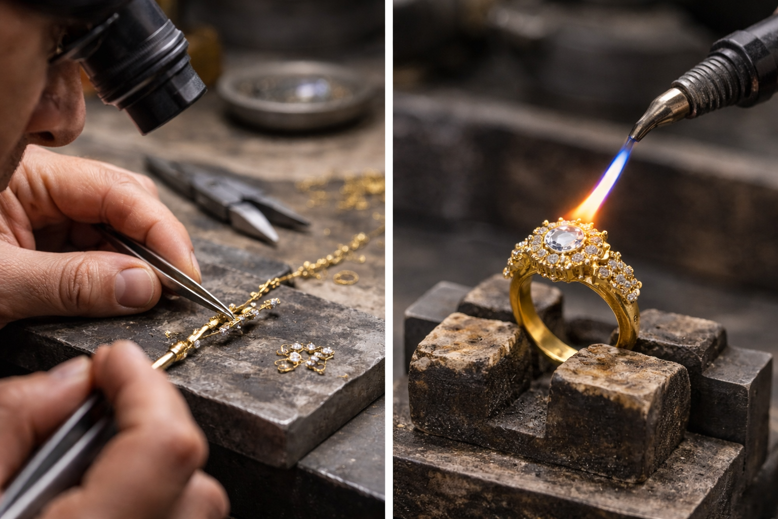 Once cast components are cleaned and inspected, assembly begins. Chains, clasps, settings and decorative elements are joined through controlled soldering processes.